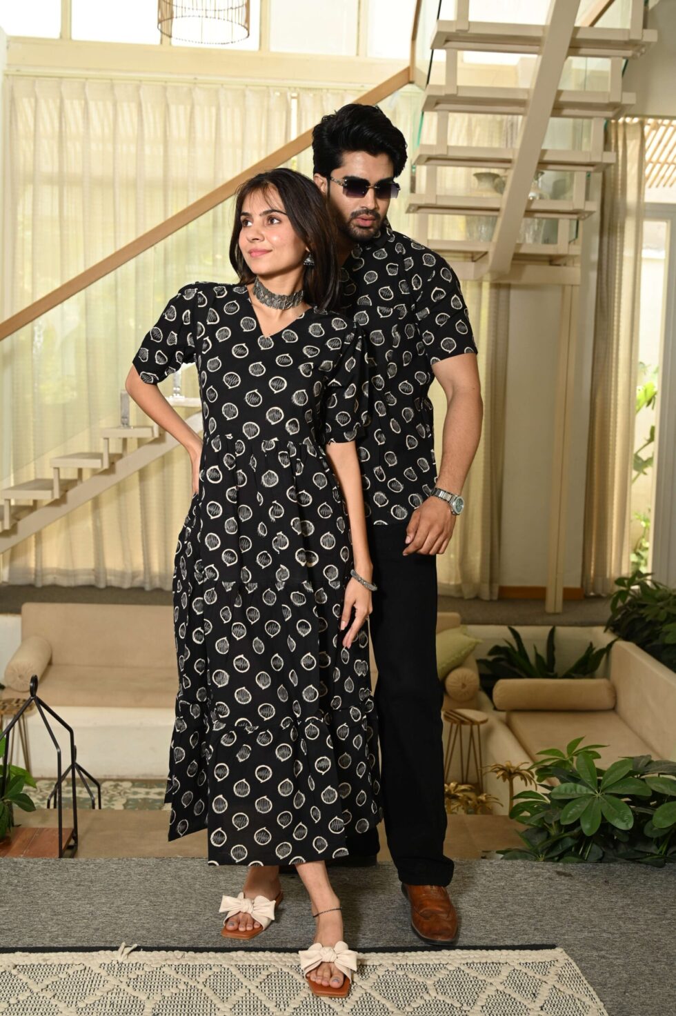 Be the first to review “Couple Matching Black Cotton Anarkali Midi Dress and Shirt Set ? Vertical Vine Block Print”